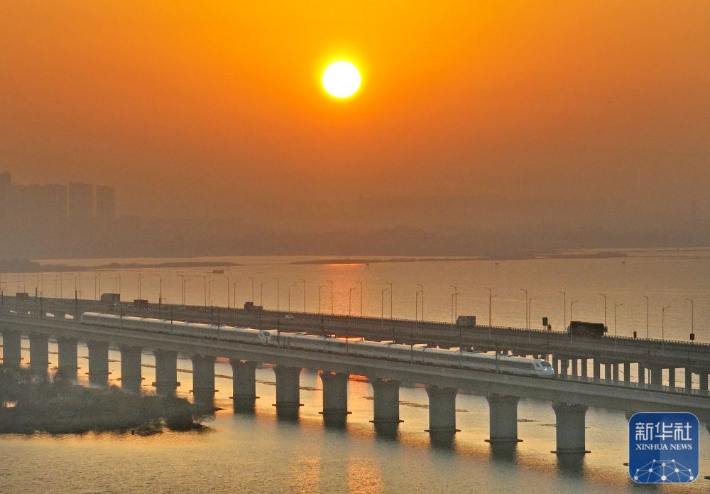 2025年1月1日,动车组列车沐浴朝阳的光辉行驶在沪宁沿江高铁江苏常州段(无人机照片)。新华社发(陈暐摄)