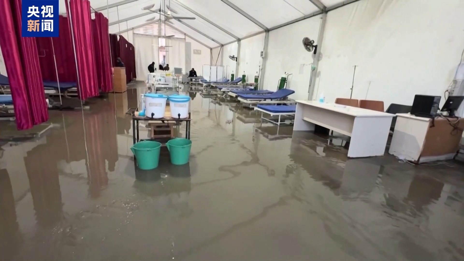 恶劣的天气同样也侵袭了加沙地带南部的汗尤尼斯,倒灌的雨水使得当地纳赛尔医院的临时病房环境更加恶化,病人和医护人员不得不与不断上涨的水位作斗争。