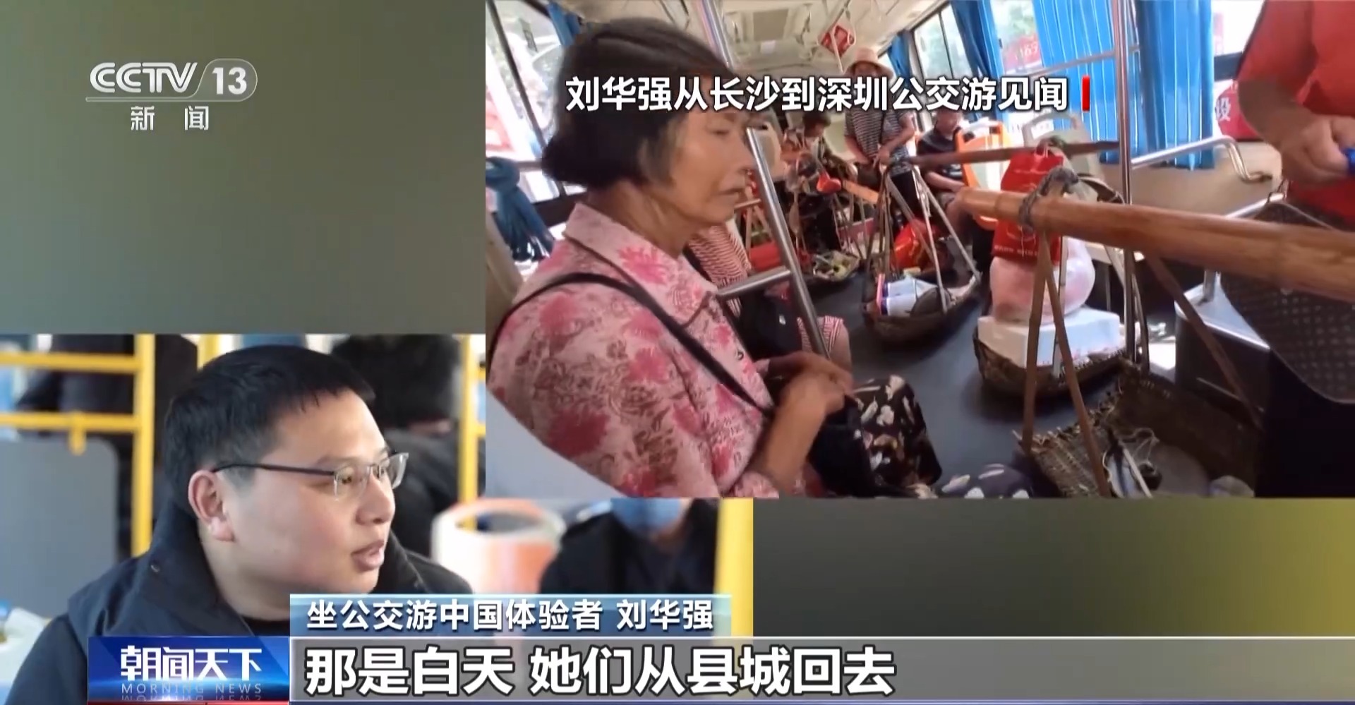 坐公交游中国体验者 刘华强:你在路上看到的这些东西,我觉得它能够给人带来很多的收获。在长沙到深圳的旅程中,遇到一辆公交车,就有很多大妈挑着卖菜的菜筐回家了,那是白天,她们从县城回去。我看着我也感觉这个场景特别亲切,因为公交车票价很实惠。这种城乡公交的发展实际上实实在在带来了获得感的一种方式。