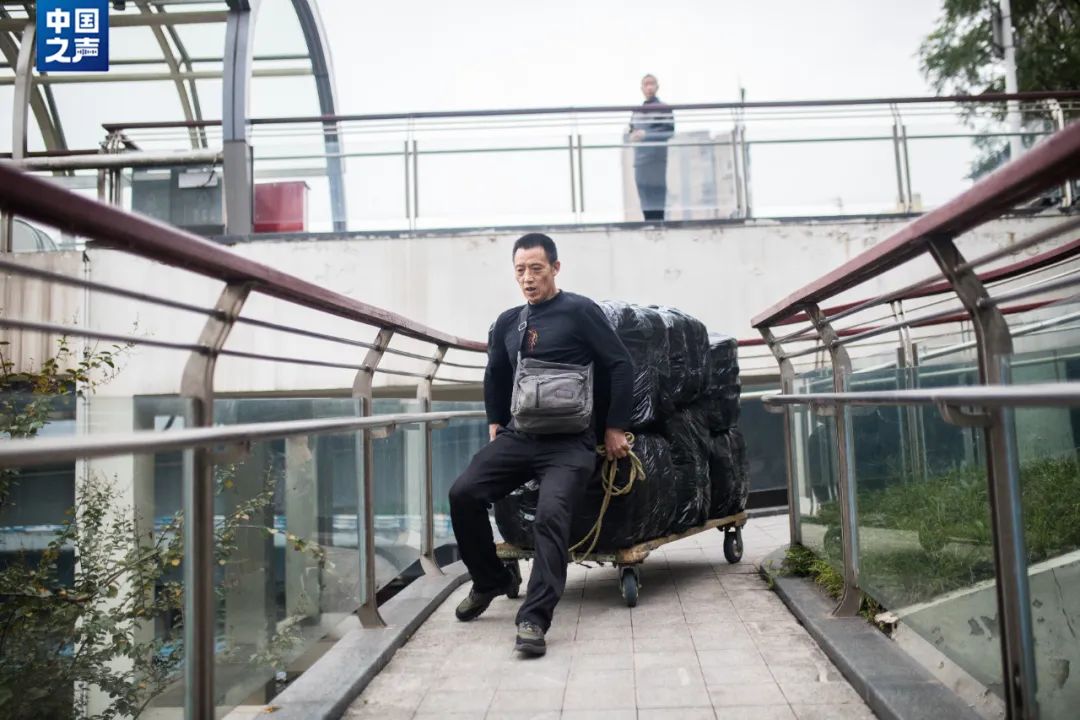 他右手提起包裹,左手轻轻一托,右胳膊抬高的瞬间,拳头轻转,厚实的包裹就稳稳地落在了肩头。看一眼货,算一下路程,他还是觉得扛着包裹走台阶,更快。