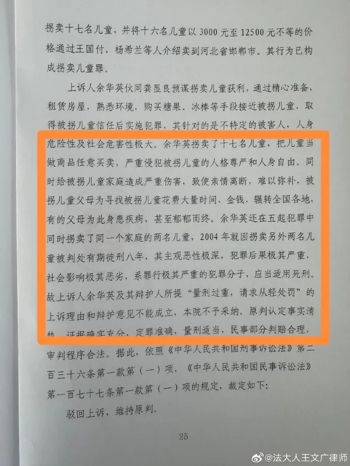 2023年9月18日,贵阳市中级人民法院一审以拐卖儿童罪,判处余华英死刑,剥夺政治权利终身,余华英提出上诉。