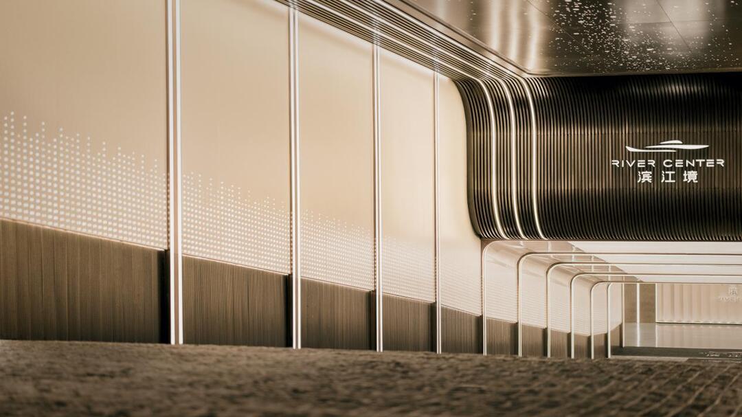 车库入口顶面采用镜面穿孔发光不锈钢配合闪烁灯光,打造夜晚星空银河感;墙面采用铝板与不锈钢长城板,材质笔挺,同时墙面增加穿孔铝板做呼吸灯,整个坡道循序渐进,仪式感十足,呈现了更强的豪宅场景力。