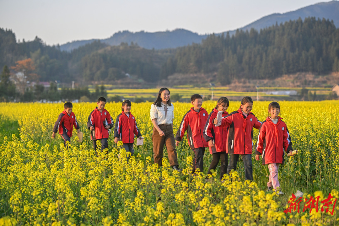 (2024年3月12日,会同县粟裕希望小学的李柏霖老师把课堂搬到田野,带领“田野诗班”的小诗人在春天里写诗。湖南日报全媒体记者 郭立亮 摄)
