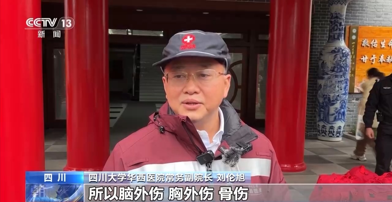 四川大学华西医院常务副院长 刘伦旭:地震中主要是房屋倒塌以及掩埋等等这些情况,所以脑外伤、胸外伤、骨伤可能是最常见的一些外伤,而且也可能是最危及生命的,这也是我们组建此次专家团队的考量。