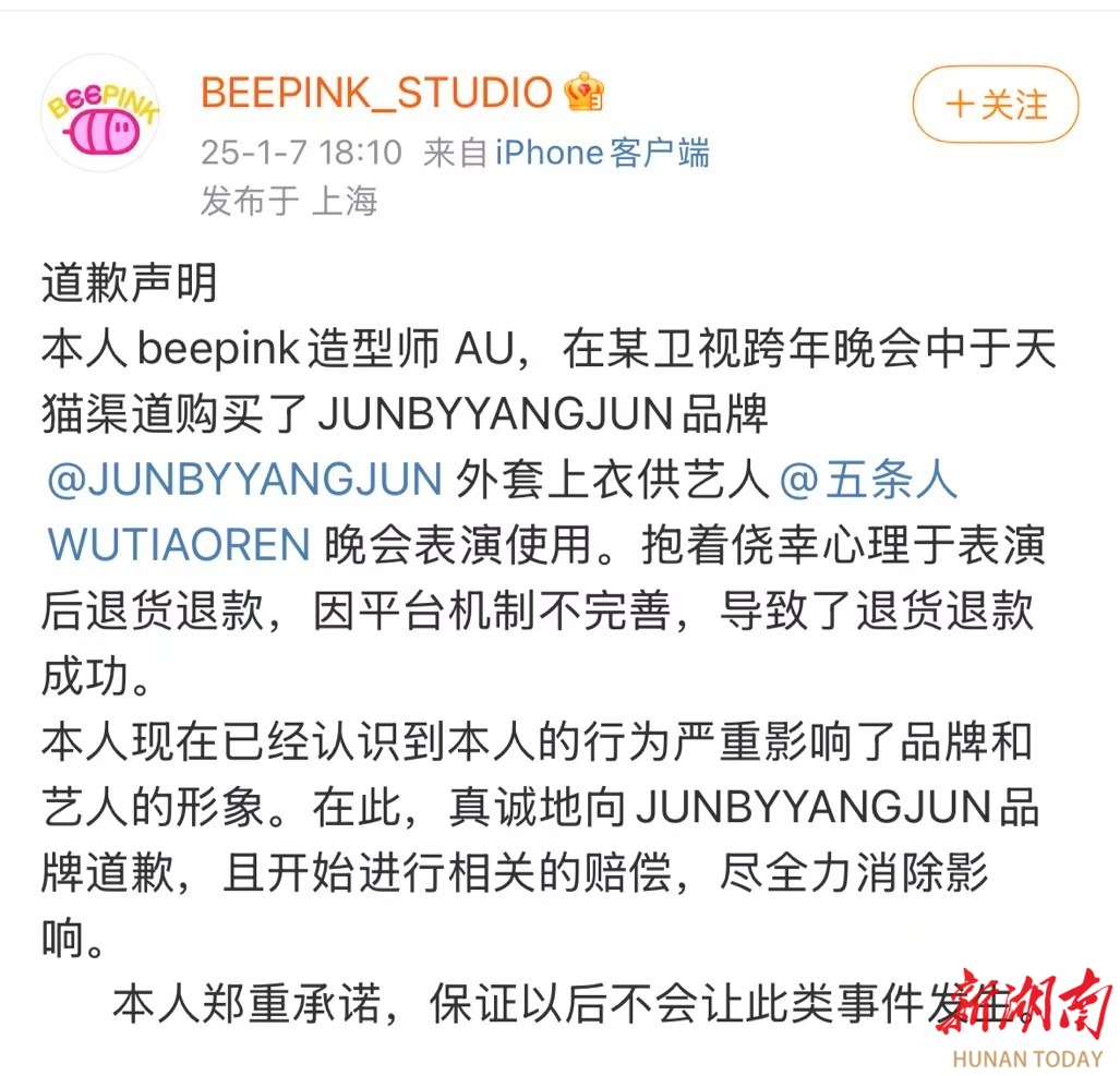 1月7日晚,五条人乐队造型师@BEEPINK_STUDIO发微博致歉。道歉帖中称:“本人beepink造型师AU,在某卫视跨年晚会中于天猫渠道购买了JUNBYYANGJUN品牌@JUNBYYANGJUN外套上衣供艺人@五条人WUTIAOREN晚会表演使用。抱着侥幸心理于表演后成功退货退款,因平台机制不完善,导致了退货退款成功。”