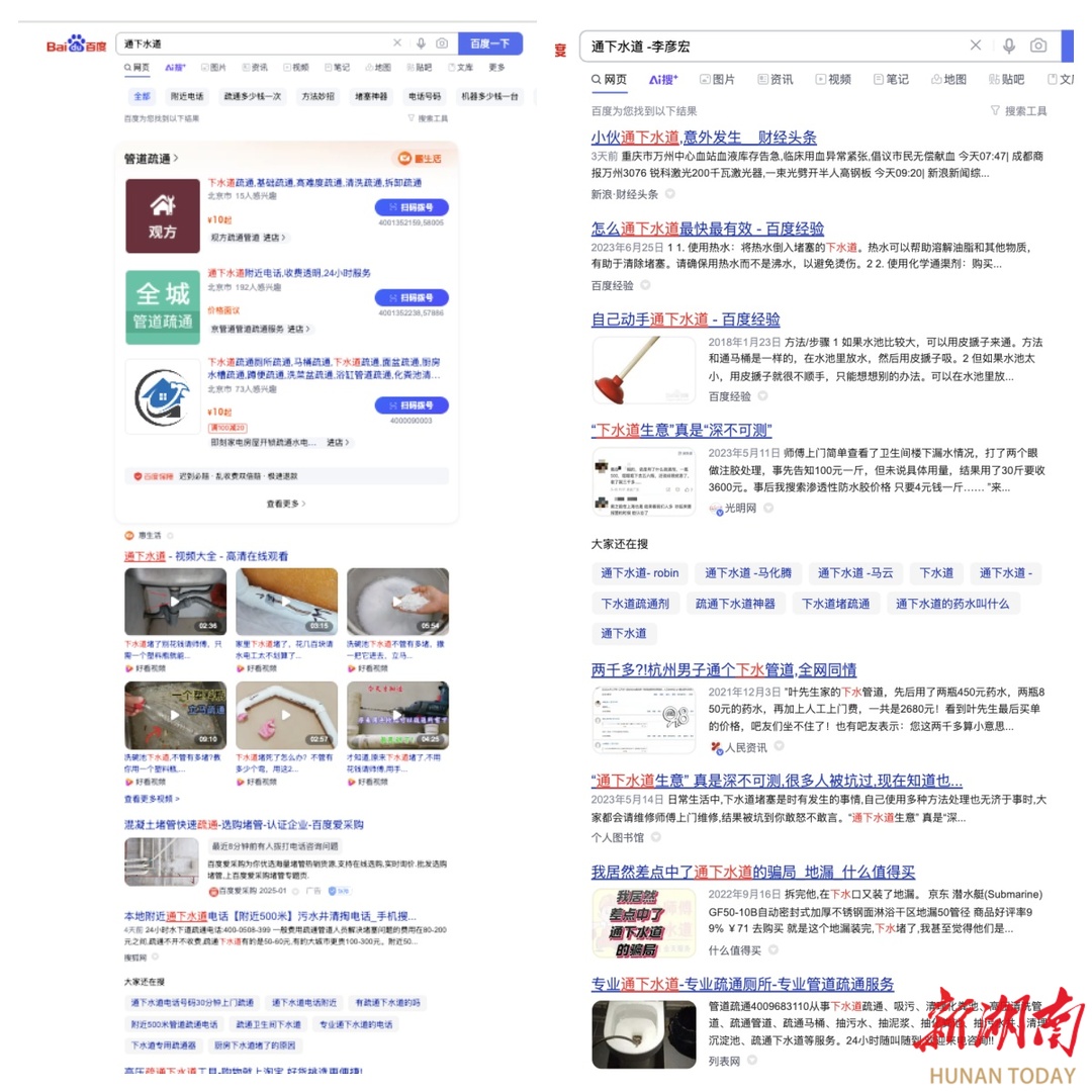 在搜索如“通下水道”这类关键词时,搜索结果的首页果然出现了若干条标注为“广告”的内容。然而,当在搜索词中加入“李彦宏”或“Robin”后,搜索结果页面变得“清爽”,广告内容不再出现,取而代之的是相关的经验分享或资讯信息。