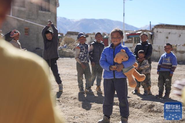 ↑1月8日,在日喀则市定日县措果乡塘仁村地震灾后安置点,西藏星光社会工作服务中心社工向孩子们赠送玩偶熊,并给他们表演节目。