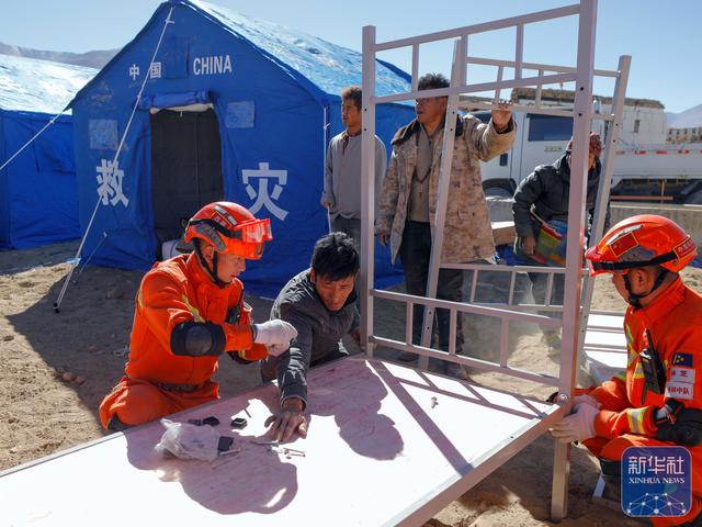 ↑1月8日,在日喀则市定日县措果乡雪珠村安置点,林芝市森林消防支队米林中队的救援人员帮助受灾群众安装领取到的床。