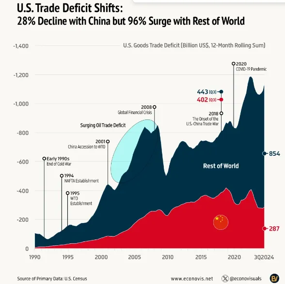 随着贸易摩擦升级,美国贸易逆差构成已经发生了重大变化。根据美国联邦普查局(USCensus)的数据,从2018年的前9个月到2024年的前9个月,美国的整体贸易逆差增长了37%,从6350亿美元上升到8720亿美元。在此期间,美国对中国的贸易逆差下降了28%,从3010亿美元降至2170亿美元。然而,与世界其他地区(不包括中国)的贸易逆差飙升了96%,从3340亿美元攀升至6550亿美元。