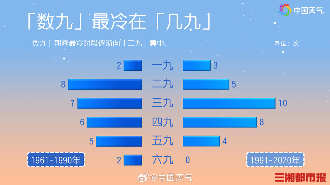 三湘都市报·新湖南客户端1月9日讯(全媒体记者 李致远)1月9日,据中国天气网统计的大数据发现,1991年至2020年的数九期间,一九二九的气温在持续下滑,三九四九时气温跌至低谷。其中三九最冷,全国平均气温为-5.14℃。五九六九开始,全国平均气温逐渐上升,到八九时升至0℃以上。不过,从2011年至2020年与1961年至1970年的对比来看,整个数九期间的气温都明显上升,像是二九、五九、七九、八九气温升幅都达到或超过2℃。