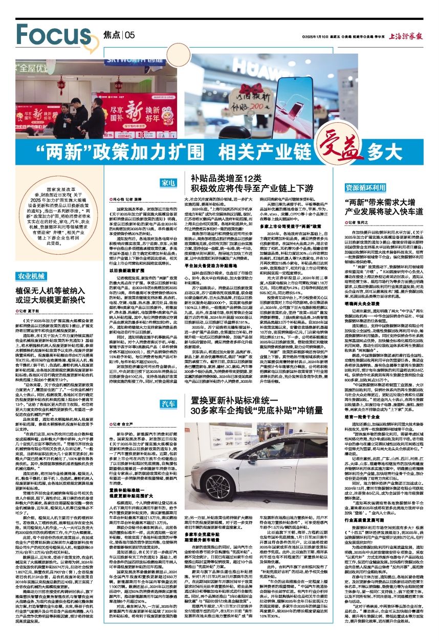 国家发展改革委、财政部近日发布《关于2025年加力扩围实施大规模设备更新和消费品以旧换新政策的通知》,推出一系列新举措。“两新”政策加力扩围,将给消费者带来实实在在的好处,家电、汽车、农业机械、资源循环利用等领域需求有望迎来“井喷”,相关产业链上下游企业也将因此受益。