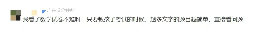 “我看了数学试卷不难呀。”一位网友不认可题目太难的说法,还热心给家长们支招:“只要教孩子考试的时候,越多文字的题目越简单,直接看问题。”