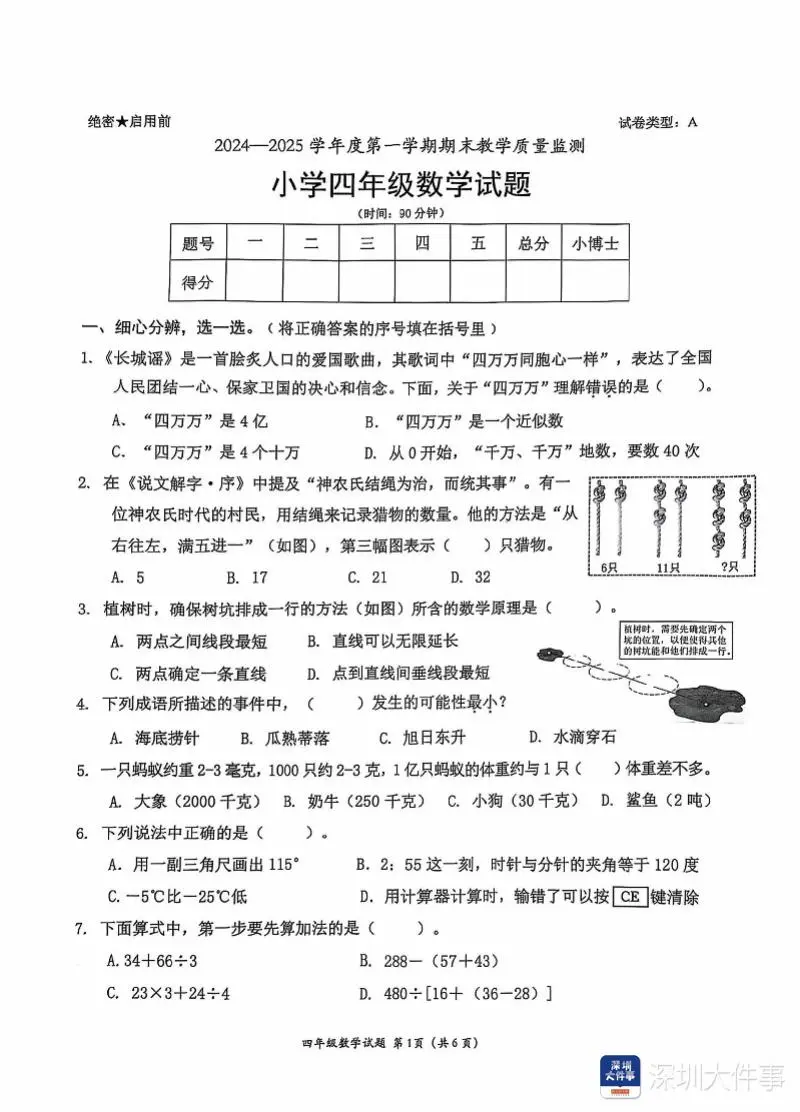 网传的南山区四年级数学试卷A卷,第一道选择题,提问“下面,关于‘四万万’的理解错误的是”。答案选项A:“四万万”是4亿,选项B:“四万万”是一个近似数,选项C:“四万万”是4个十万,选项D:从0开始,“千万、千万”地数,要数40次。