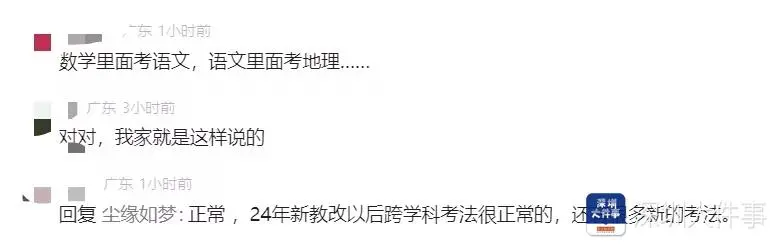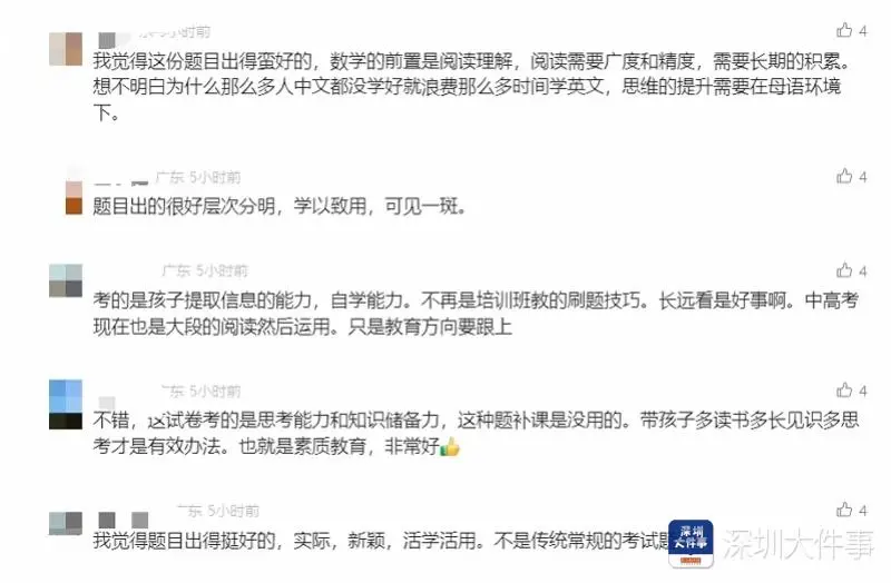 “成年人不要用学习开油、电车的经验和技术,指导将来开飞机、火箭的孩子啦。”“数学考生活很好啊,生活无处不数学,比传统考题有意思多了,南山值得全国学习。”