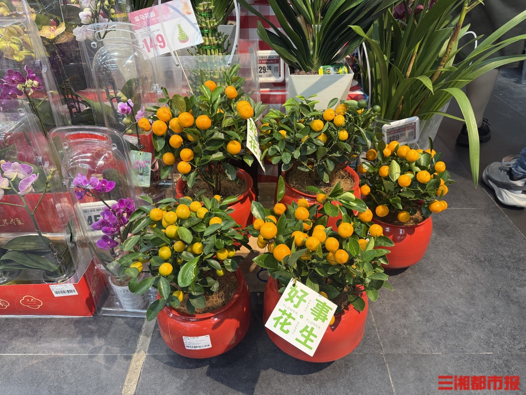而一旁的鲜花区域工作人员热情地介绍,今年养成系年宵花是大热门,“店内除了开花结果的草莓盆栽,还有售价99元一盆的金桔盆栽、39.9元—59.9元价格不等的朱顶红也是养成系的首选。”她一边说着,一边指向鲜花摆放区域。记者看到,一颗颗饱满的小金桔仿若一盏盏小灯笼挂在枝丫上,旁边还有“好事发生”的装饰卡片,配色年味十足且颜值颇高。给足消费者们情绪价值、有着“注定红”谐音的朱顶红,则被包装在精致的小纸盒内,其根部被红色的蜡给封住保鲜,上面的花苞已初具雏形。“这两款年宵花虽然是养成系的,但并不需要费心打理,很省事。”盒马鲜生鲜花区域工作人员表示,正是因为如此,再加上养成系年宵花不仅满足了顾客对花卉观赏的需求,还增加了他们的参与感和乐趣,所以很受欢迎。近期,成为顾客们的心头好。“快过年了,这几天来购买的特别多,颇有赶超传统年宵花之势。”