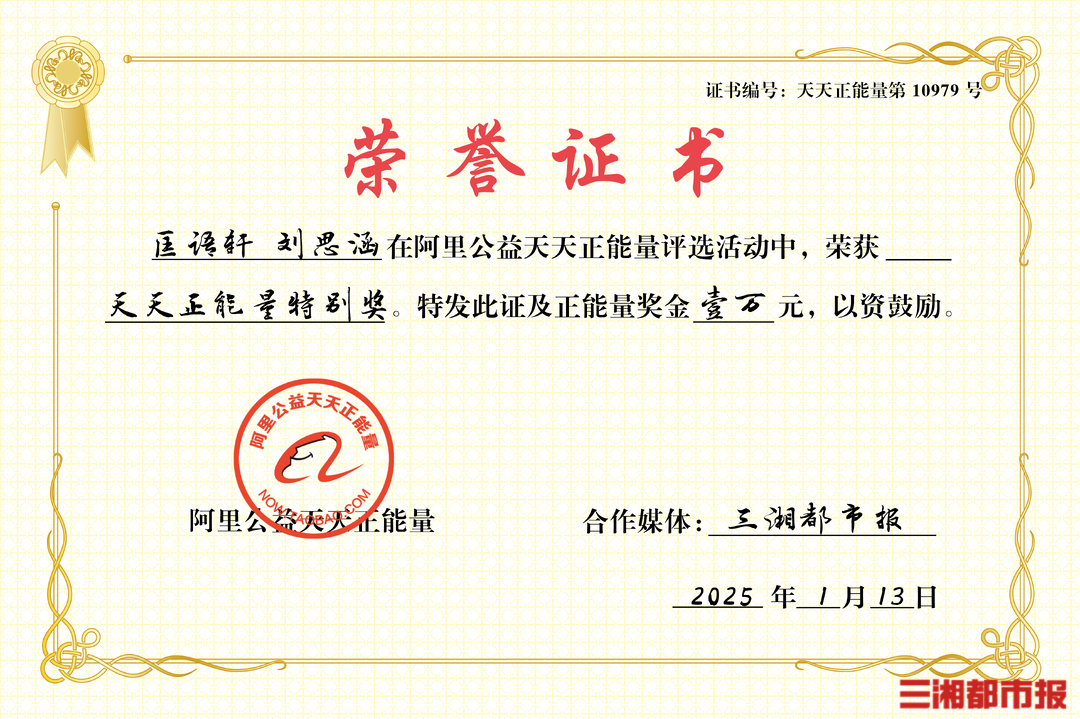 1月13日,三湘都市报联合阿里公益天天正能量,为匡语轩、刘思涵颁发天天正能量特别奖及10000元奖金。