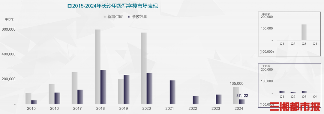 2024年,长沙金茂大厦如期交付,为长沙甲级写字楼市场带来13.5万平方米的新增供应,推动市场总存量升至231.1万平方米。今年市场活跃度有所放缓,全年净吸纳量共录得3.7万平方米,同比去年下降62.1%。