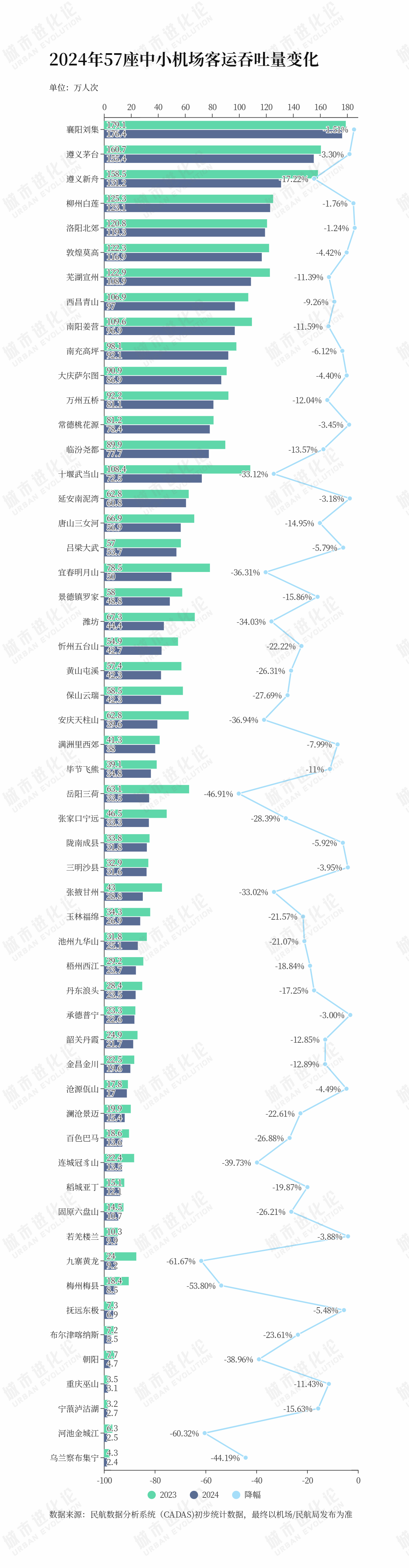 但并非每座中小机场都能如此幸运。在民航数据分析系统初步统计的250座机场2024年客流量中,仍有超50座中小机场的客流量出现逆势下滑。