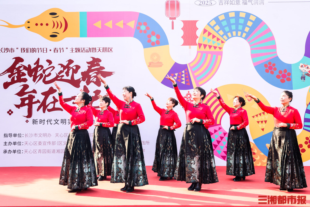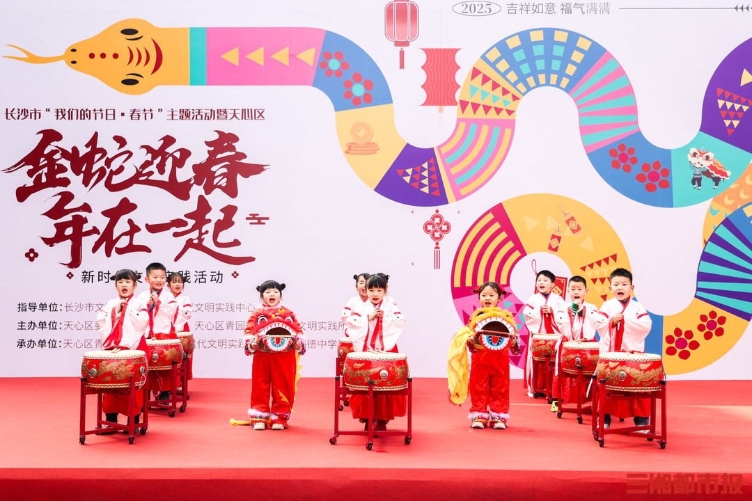 舞蹈《盛世欢歌》的音乐声中,现场气氛达到高潮,穿着喜庆年服的娃娃们整齐划一,在舞台上跟着音乐节拍打鼓,赢得阵阵掌声。社区老年大学文艺骨干排练的《金蛇贺岁闹非遗》吸引了不少花鼓戏迷。身着马面裙登场的银发T台秀、古韵悠扬的民乐表演《关关雎鸠》轮番登场,让小区居民们提前感受到家门口的“春晚”。