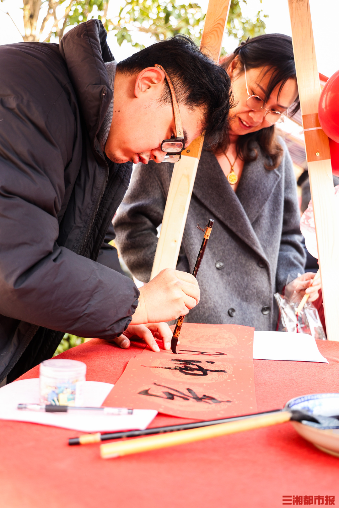 “蛇行大运想啥来啥,龙隐福年盼财得财”“蛇戏新春萌态逗乐邻里,人迎瑞岁笑颜温暖社区”,写春联的摊位前,书法老师铺开红纸、挥毫泼墨,一幅幅“蘸”满祝福的春联随笔尖流动而出,一张张红红火火的“福”字跃然眼前。