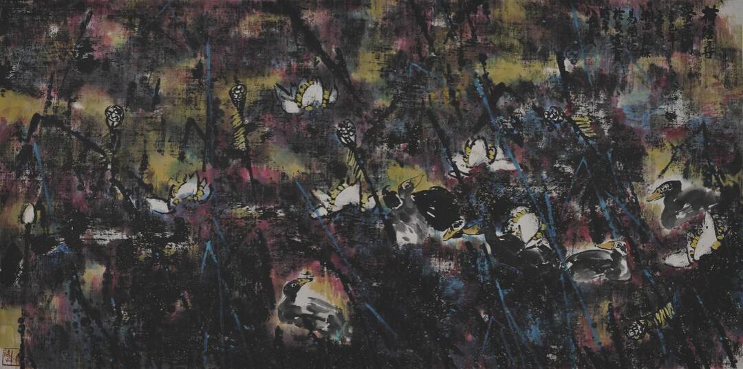 易老的国画,尤其是他的花鸟画,在某种程度上打通了艺术的蕴含与大众的期盼,即使是普普通通的山区景象和平凡无奇的田园生活,在他的笔下,也显得那么富有生机活力。他善于利用通感与移情,有时将熟悉的生活陌生化,有时又将陌生的生活熟悉化,如《盛世荷韵》,画面枝干挺拔、荷花开得正艳的荷塘,是大家都熟悉的场景,但他又用几笔鹅黄,使满塘荷花增添了陌生感,却又契合了作者出新出彩的心理特征;另外,涂满红色的荷塘(《红色的荷池》),艳红耀眼的鸭嬉图(《秋塘恋》),红霞满天的芭蕉林(《无题》),都是熟悉的陌生化,打破人们观赏作品时只衡量“像还是不像”的简单评价。这些一反常规的用意,产生了很强的视觉冲击力,就不仅仅只是形式的创新与探索,更是在绘画观念与绘画思想上实践更新与超越。