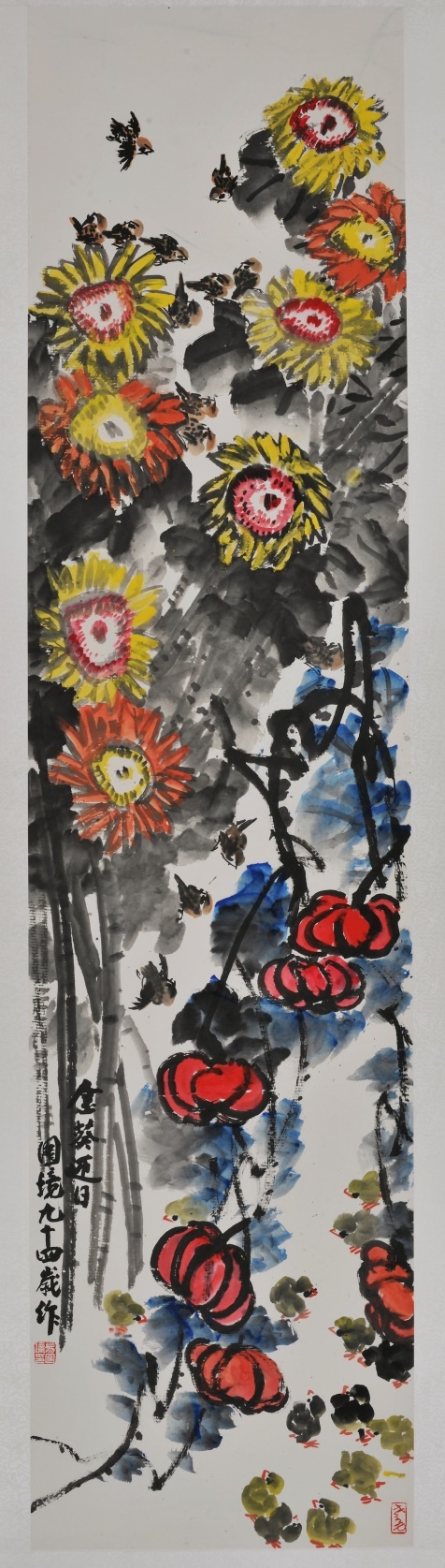 如他的《金葵迎日》,金黄色的向日葵迎着旭日舒展开来,就像一张张绽开的笑脸;小鸟欢快地穿梭在向日葵花的四周,比邻的南瓜藤架上挂着一串硕大的南瓜;一群可爱的毛茸茸小鸡正在无忧无虑地嬉耍觅食着……在十分平凡习以为常的田园风光中,呈现出一派祥和秀丽的景色与和美幸福的感受,但又在无言地传递着作者对和平与美好生活的向往。在《群鸡图》中,一群鸡冠红艳、排列齐整的硕鸡,在丽日招展的向日葵下昂首向上,仿佛在聆听或者是憧憬什么?在这些画面里,我们所感受到的是昂扬向上的勃勃生机,经风沐雨之后,对平静安宁美好生活的期盼,虽然所描绘的物象都很平凡,我们却从平凡的物象里,读出了对和平和谐和美生活的一往情深,对旺盛生命力的无限憧憬与礼赞。