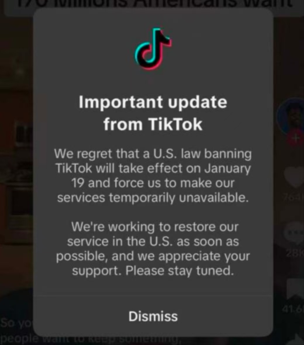 TikTok公司早前发布的通知内容显示:我们很遗憾,一项封禁TikTok的美国法律将于1月19日生效,并迫使我们暂时停止提供服务。我们正尽快努力在美国恢复我们的服务,我们感谢各位的支持。请保持关注。