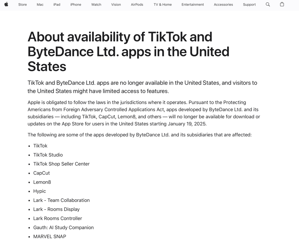 当地时间1月19日,苹果美国官网发布《关于TikTok及字节跳动有限公司应用程序在美国的可用性》声明指出,TikTok及字节跳动多款应用程序在美国已不再可用,美区用户可能会面临功能受限的情况。