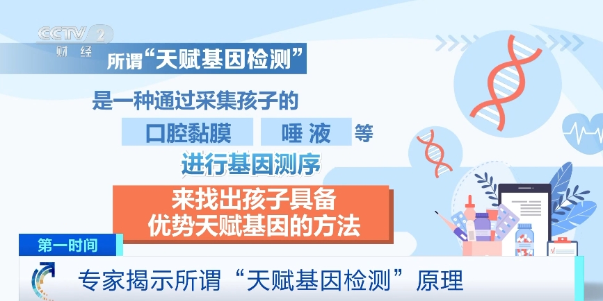 专家表示,所谓“天赋基因检测”,是一种通过采集孩子的口腔黏膜、唾液等进行基因测序,来找出孩子具备优势天赋基因的方法。主要是通过检测个体基因组中特定的基因型或突变,来评估与某些能力或特征相关的遗传倾向。