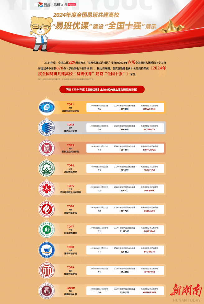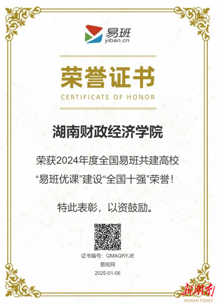 近日,2024年度全国易班共建高校“易班优课”建设评选结果公布,湖南财政经济学院荣获2024年度全国易班共建高校“易班优课”建设“全国十强”荣誉。这是我校继2021年以来,第三次获得此项殊荣。