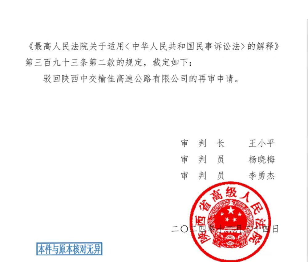2024年12月24日,陕西高院驳回榆佳高速公司再审申请。