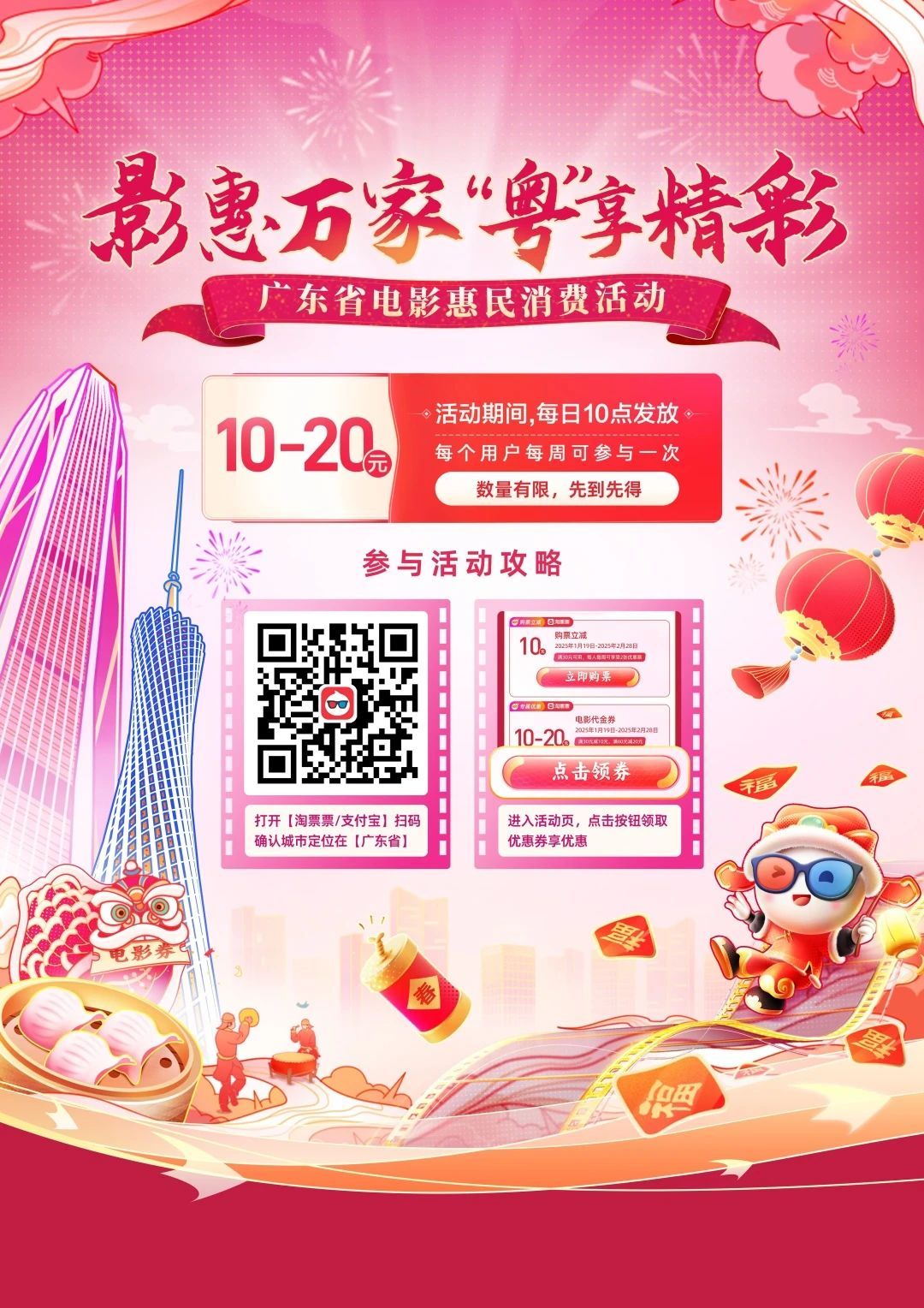 由广东省电影局主办的“影惠万家,‘粤’享精彩”电影惠民消费活动将于1月19日10:00启动,春节档电影早上9:00开售,各大购票平台补贴全面上线。1月19日—2月28日,活动期内,影城所有场次均可使用该优惠券。
