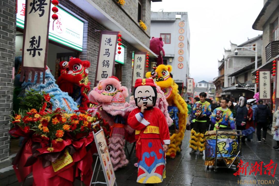 开业当日,黔阳古城东正街宛如一幅热闹非凡的民俗画卷。威风凛凛的舞狮队伍灵动跳跃,在锣鼓喧天中显祥瑞之气;庄重的揭牌仪式,为这条承载着千年历史与美食文化的老街揭开了崭新篇章;憨态可掬的“财神”穿梭在人群中,为大家送上新春祝福,现场处处洋溢着欢声笑语,热闹氛围被推向一波又一波高潮。