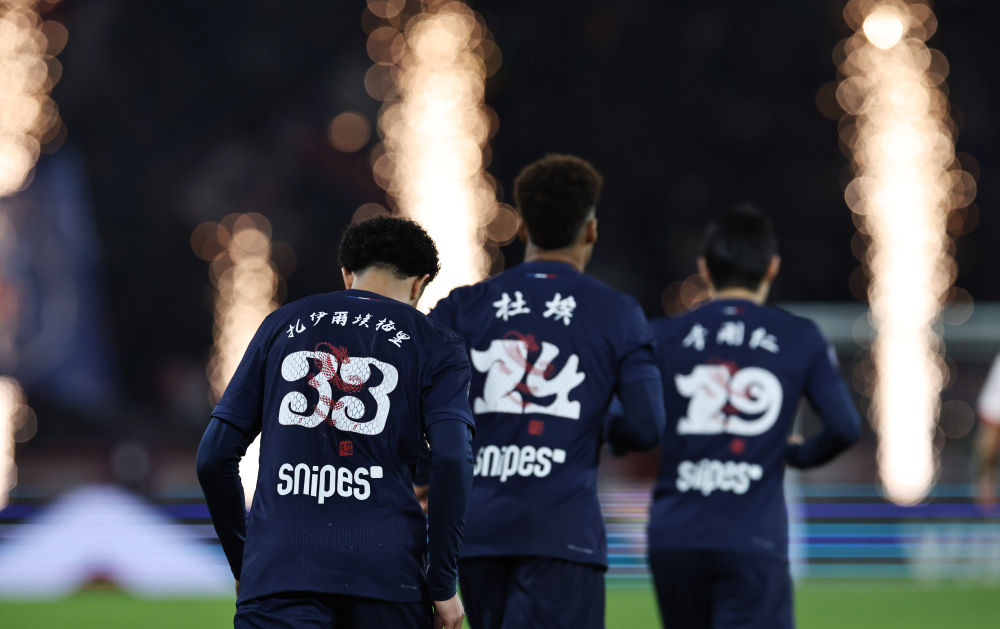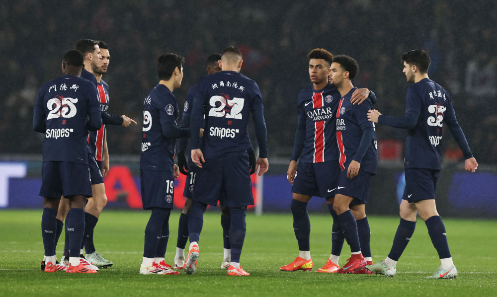↑1月25日,在法国巴黎王子公园球场,身着印有中文和蛇年元素球衣的巴黎圣日耳曼队球员在对阵兰斯队的比赛前。