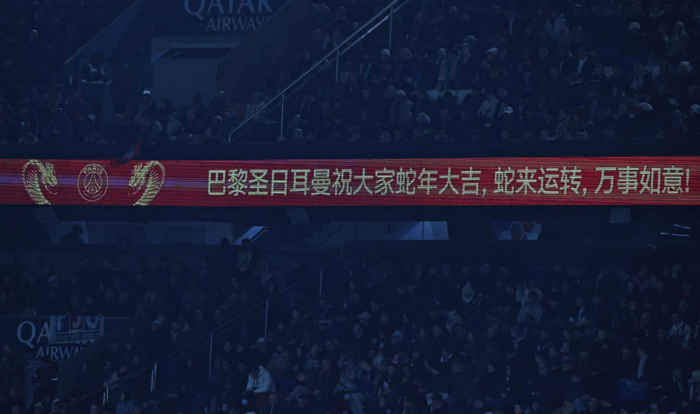 ↑1月25日,在法国巴黎王子公园球场,场边的广告屏上显示迎接蛇年春节的祝福语。