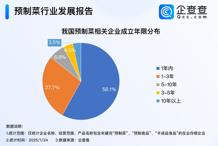 企查查数据显示,2024年我国预制菜相关企业注册量首次破万家,全年注册量同比增加147.8%至10661家;成立年限上,我国近六成预制菜相关企业于1年内成立;行业分布上,我国预制菜相关企业主要分布在批发和零售业、住宿和餐饮业2个行业,其中批发和零售业企业占比44%。