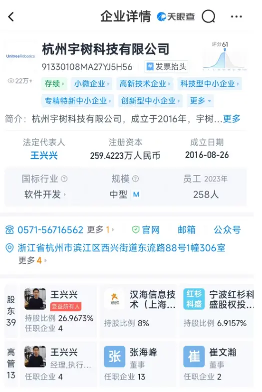 据天眼查,宇树科技是一家来自杭州的具身智能创业公司,成立于2016年,创始人为王兴兴。资料显示:王兴兴,1990年出生于浙江宁波,机械工程硕士,UnitreeRobotics(宇树科技)创始人、CEO、CTO。