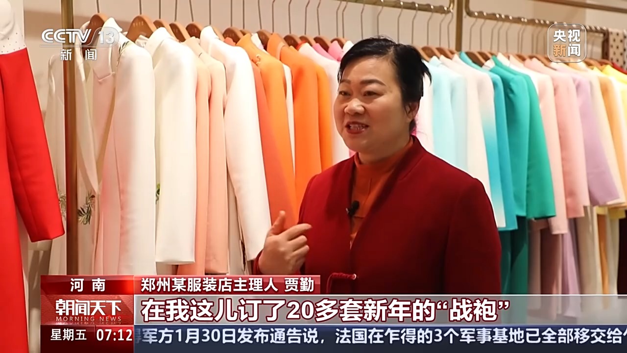 河南郑州某服装店主理人 贾勤:前些天线上的顾客在我这儿订了20多套新年的“战袍”,有北京的、广州的、海南的,还有昆明的,这个月的销售额比上个月高了三四成。
