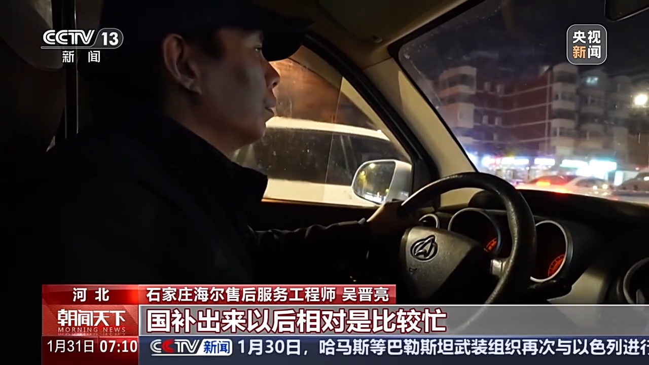 河北石家庄海尔售后服务工程师 吴晋亮:这是第6单了。国补出来以后相对是比较忙,经常会有加班的情况,只要客户有需求,哪怕是大年三十、初一、初二,我们都不休。