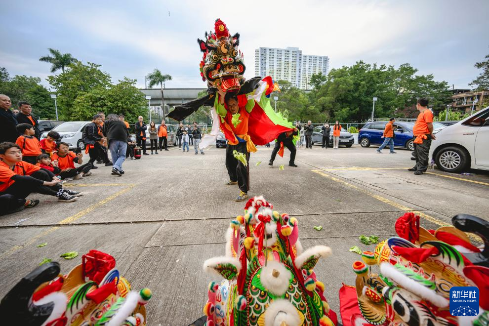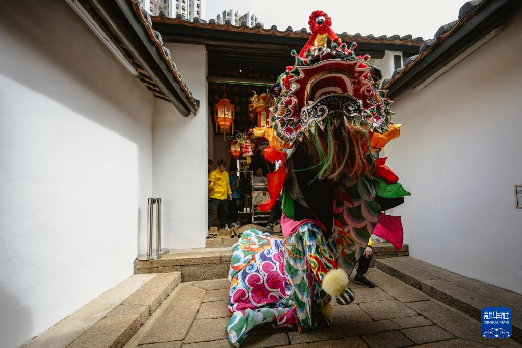 香港海陆丰狮艺体育会成员在位于三栋屋博物馆的香港非物质文化遗产中心表演舞麒麟(2024年12月15日摄)。新华社记者 朱炜 摄
