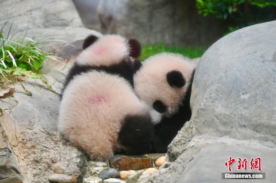 图为大熊猫“家姐”(右)与“细佬”亲密互动。中新网记者李志华摄