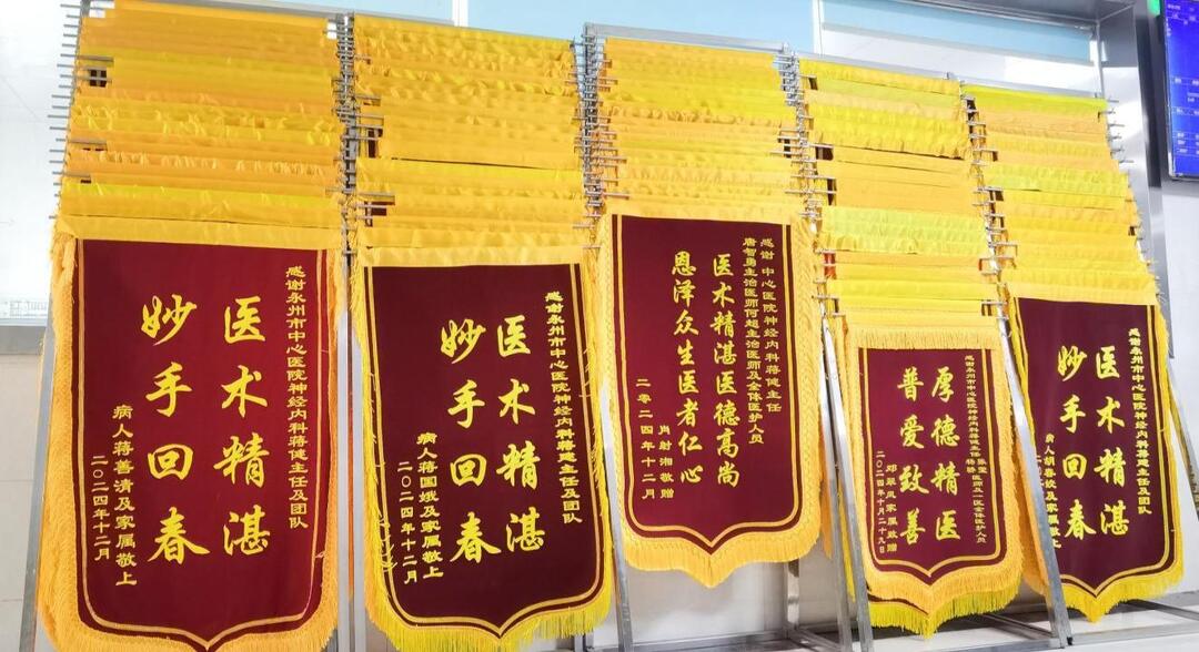 边走边看边聊。在导诊台的一边,有一个专用支架留人目光,上面挂着上百面锦旗。我知道,每一面锦旗背后都会藏着一个感人的故事。
