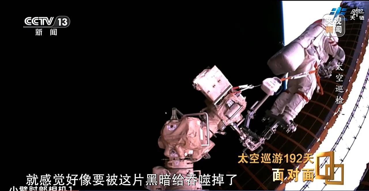 李广苏:爬时间久了之后手很累,因为手腕这块一直在持续地在发力,持续时间长了之后,需要停下来休息休息,再继续进行转移。特别是到了阴影区,阳照区还好,阳照区能看见空间站,包括地球看着比较踏实,比较安心。但是到了阴影区以后,你要不开灯,你就感觉下面深不见底,深邃的那种黑。