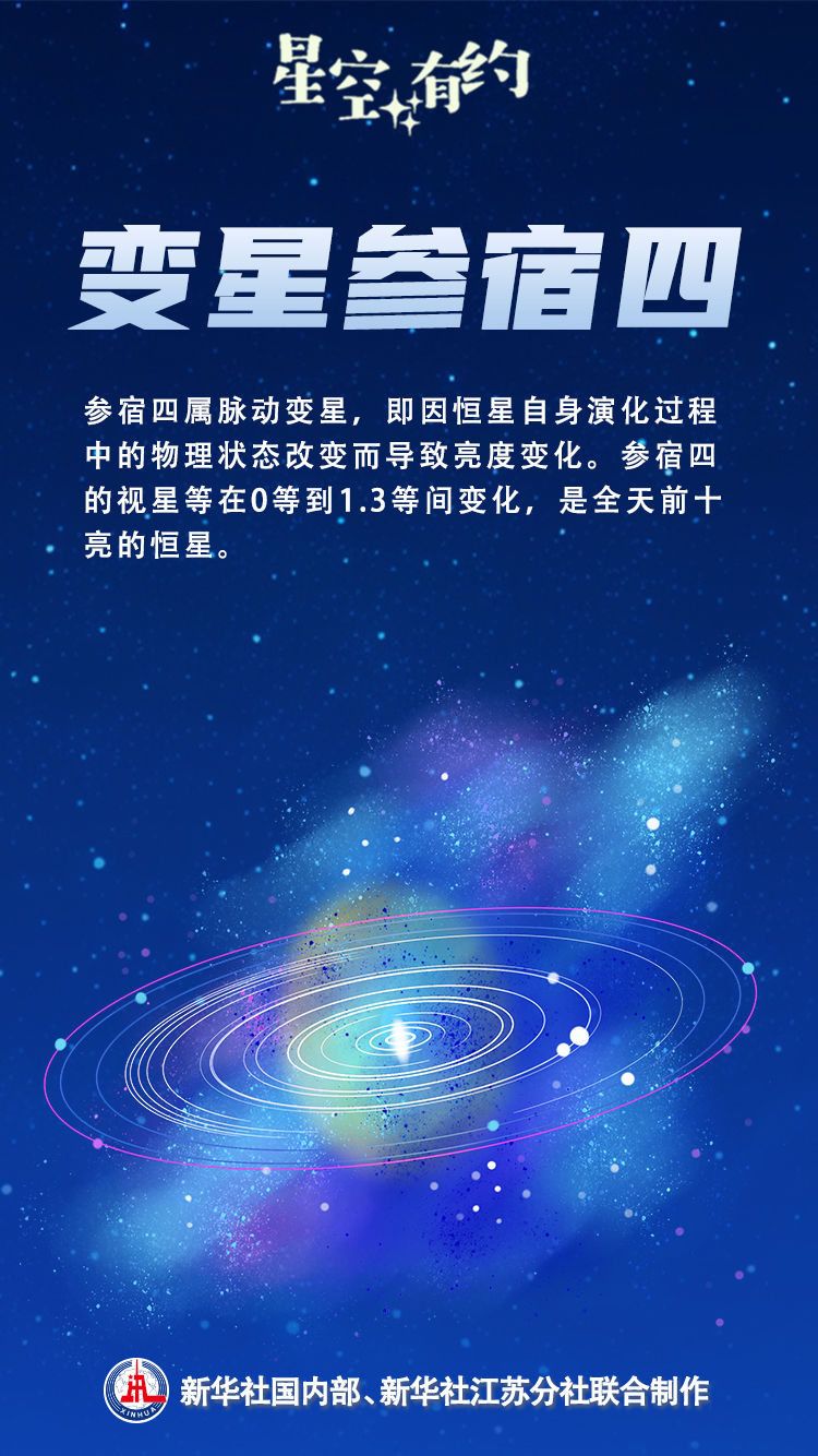 除了爆炸,参宿四身上还有不少有趣的知识点值得了解。比如,它的直径很大,约为太阳直径的几百倍。另外,参宿四也是全天前十亮的恒星之一。“之所以说参宿四亮度位居前十而没有具体的排位,是因为它是一颗变星,视星等在0等到1.3等间变化,亮度变化周期存在一个416天的短周期和2000多天的长周期,这也是它时明时暗的原因。”王科超说,目前,参宿四的亮度在0.5等左右。它属脉动变星,即因恒星自身演化过程中的物理状态改变而导致亮度变化。