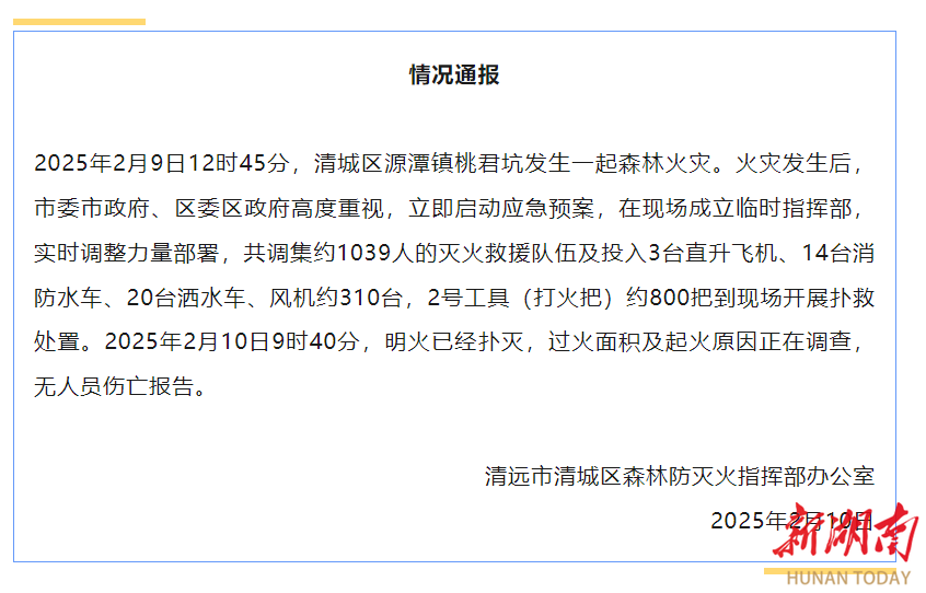 2月10日上午,清远市清城区森林防灭火指挥部办公室通报:2月9日,12时45分,清城区源潭镇桃君坑发生一起森林火灾。火灾发生后,清远市委市政府、清城区委、区政府高度重视,立即启动应急预案,在现场成立临时指挥部,实时调整力量部署,共调集约1039人的灭火救援队伍及投入3台直升飞机、14台消防水车、20台洒水车、风机约310台,2号工具(打火把)约800把到现场开展扑救处置。2025年2月10日9时40分,明火已经扑灭,过火面积及起火原因正在调查,无人员伤亡报告。