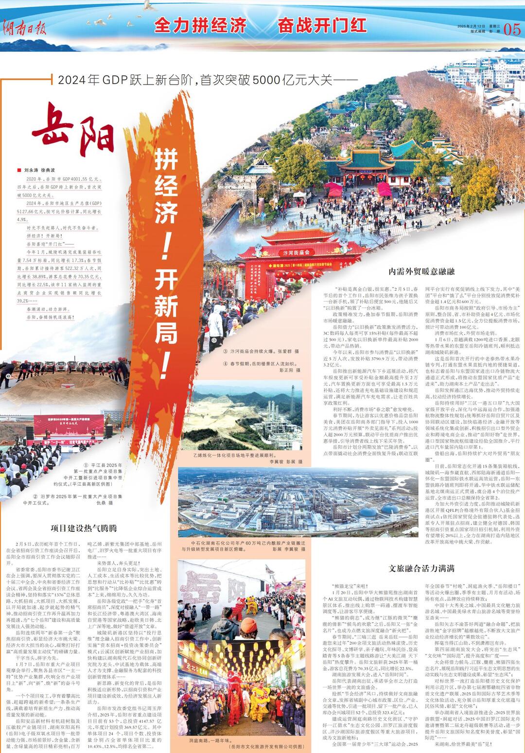今年1月,城陵矶港完成集装箱吞吐量7.54万标箱,同比增长17.3%;春节假期,岳阳累计接待游客522.32万人次,同比增长38.89%,游客总花费为70.35亿元,同比增长22.5%,该市11家纳入监测的重点商贸企业实现销售额同比增长39.2%……