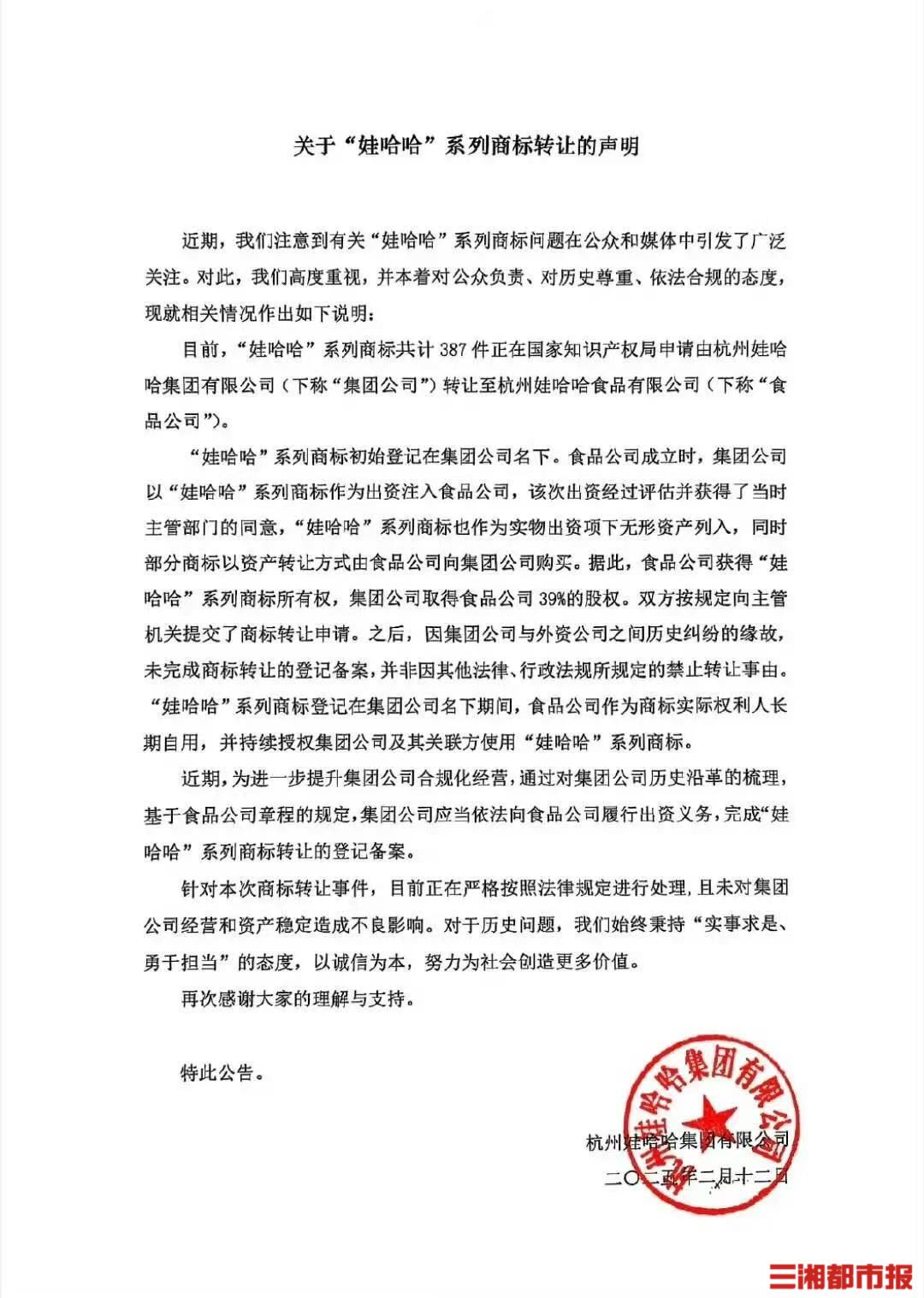 据声明介绍,目前,“娃哈哈”系列商标共计 387件正在国家知识产权局申请由杭州娃哈哈集团有限公司(以下简称“集团公司”)转让至杭州娃哈哈食品有限公司(以下简称“食品公司”)。