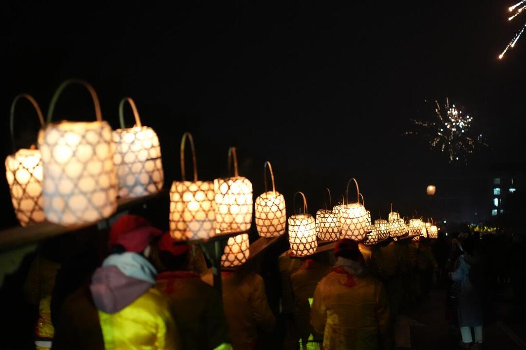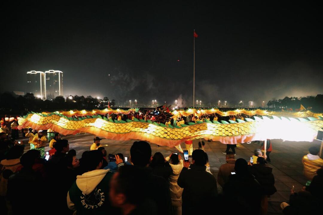 祈福结束,礼炮骤响,在升腾的孔明灯下,一支非遗巡游队造型各异,敲锣打鼓穿街而过,吸引大批民众围观接福,人数高达数万人。非遗巡游队分为百敬龙方阵、汉服方阵、探灯方阵3个方阵,从龙王庙出发,经市民广场,到春联社区“门前三小”结束,全程6公里左右。