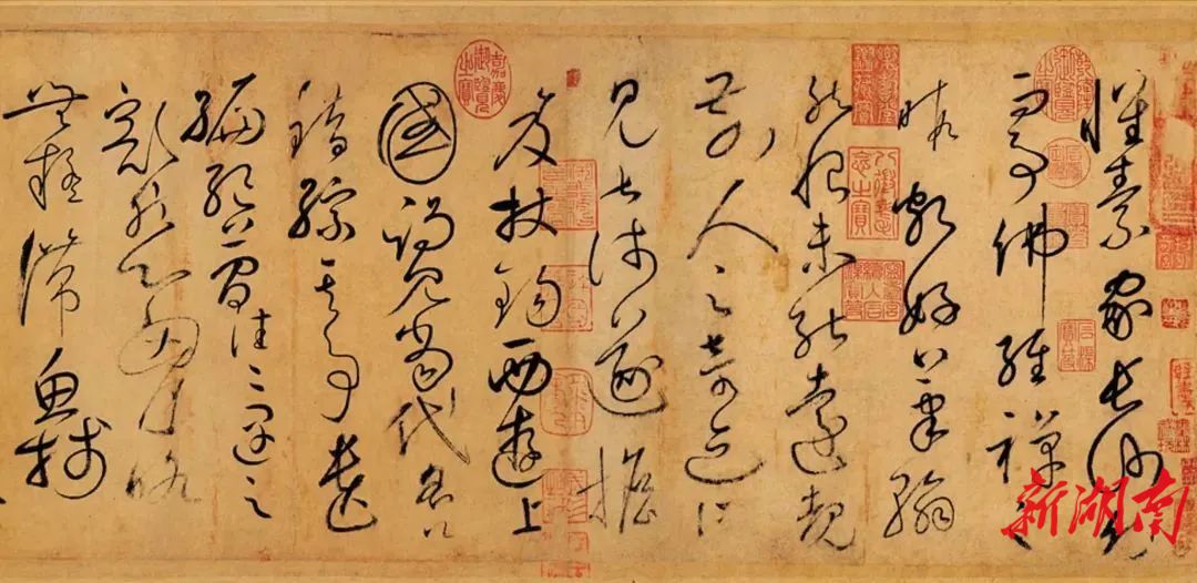 为什么会选怀素及其《自叙帖》为主背景?因为历史上的怀素一直活跃在舞台的中央,从来未曾离开过。有人说,怀素是史上最不像和尚的和尚。笔者认为这是一种褒扬,怀素是中国书法史上草书的巅峰,在诸多方面均修炼到了极致。他比书圣王羲之更刻苦,王羲之顶多是“入木三分”,怀素则“盘板皆穿”。他的狂放比肩张旭,张旭“脱帽露顶王公前,挥毫落纸如云烟”,怀素则“忽然绝叫三两声,满壁纵横千万字”,“颠张狂素”“张颠素狂”“颠张醉素”已成为人尽皆知的固定成语。他发明了一种新的狂草笔法,笔者为其冠名“瘦劲回环体”,既有骨感美又极富劲力。他饮酒堪比李白,李白千杯不醉,怀素一日九醉。他收到的名流赠诗最多,现可核查的数据为39篇,在书法界可谓前无古人、后无来者。他自作自写的简介最能打动人,《自叙帖》就是怀素的自我简介,书法界公认《自叙帖》乃“吹牛”的最高境界,其策略堪称营销学的经典范例!