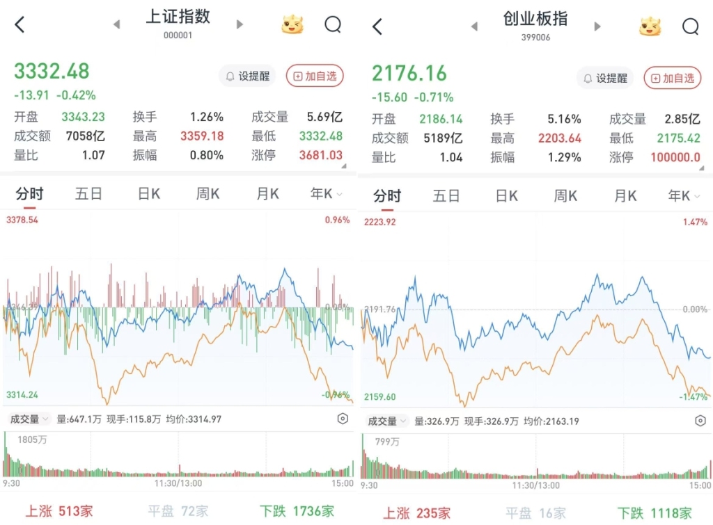 至收盘,上证综指跌0.42%,报3332.48点;科创50指数跌2.31%,报1017.09点;深证成指跌0.77%,报10626.62点;创业板指跌0.71%,报2176.16点。